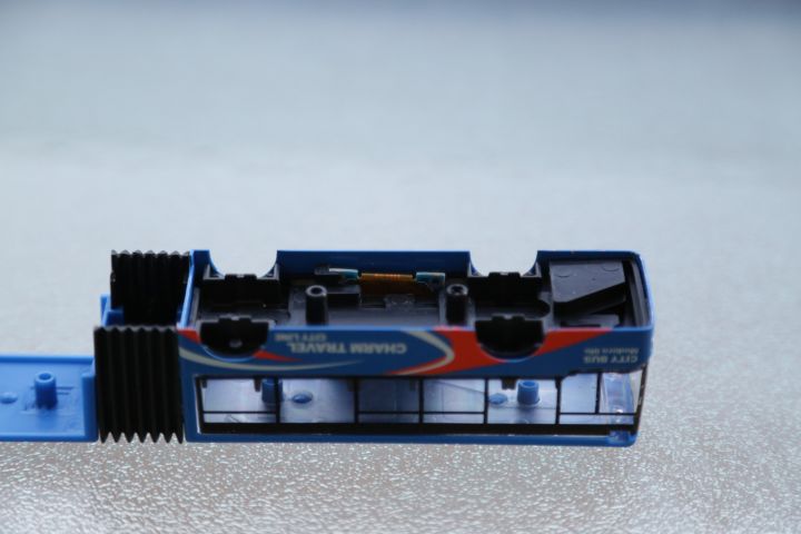 On the bottom side, the bus had rows of plastic seats, which you can see in the photos. These seats were originally too high to allow the screen to pass between them, but carving a small piece with the rotary tool allowed the screen to be sandwiched between the wall/windows and the seats.