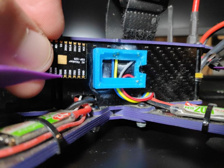 So, I designed a mount that I glued onto the side of the quad. Simply pop the bare ESP8266 in, and you can connect to the drone over wifi while in flight. Pop it out, and USB becomes available. It has pogo pins for ensuring a good connection and a snug fit so I won't lose connection mid-flight.